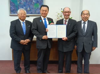 5月1日、島根県庁において、丸山知事と島根県警備業協会の役員が、協定の再締結にともない懇談をしました。